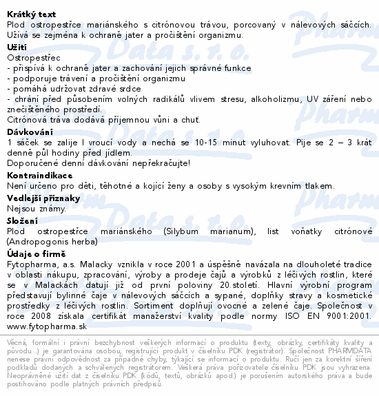 Plod ostropestřce mariánského s citrónovou trávou, porcovaný v nálevových sáčcích. Užívá se zejména k ochraně jater a pročištění organizmu.