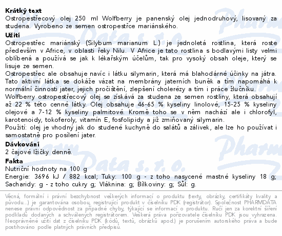 Ostropestřecový olej 250 ml Wolfberry je panenský olej jednodruhový, lisovaný za studena. Vyrobeno ze semen ostropestřce mariánského.