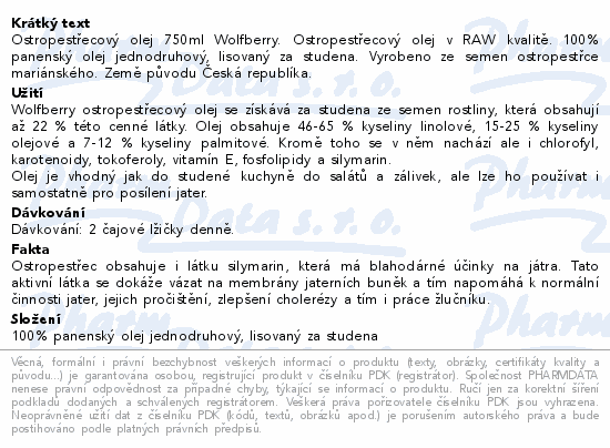 Ostropestřecový olej 750ml Wolfberry. Ostropestřecový olej v RAW kvalitě. 100% panenský olej jednodruhový, lisovaný za studena. Vyrobeno ze semen ostropestřce mariánského. Země původu Česká republíka.