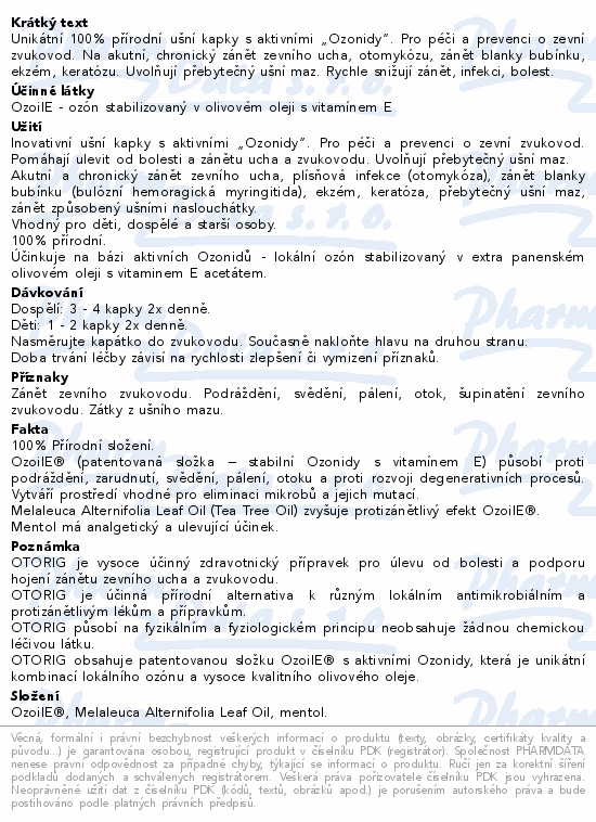 Unikátní 100% přírodní ušní kapky s aktivními „Ozonidy“. Pro péči a prevenci o zevní zvukovod. Na akutní, chronický zánět zevního ucha, otomykózu, zánět blanky bubínku, ekzém, keratózu. Uvolňují přebytečný ušní maz. Rychle snižují zánět, infekci, bolest.
