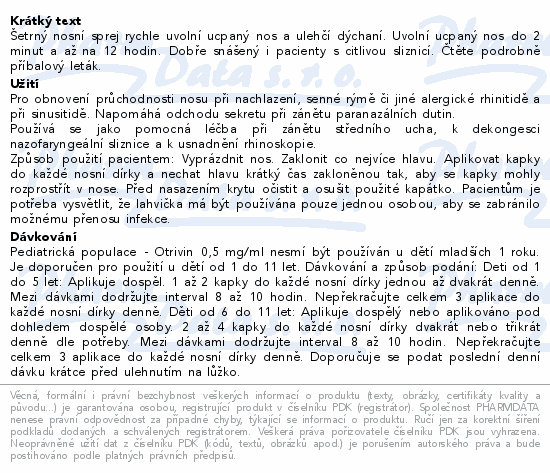 Šetrný nosní sprej rychle uvolní ucpaný nos a ulehčí dýchaní. Uvolní ucpaný nos do 2 minut a až na 12 hodin. Dobře snášený i pacienty s citlivou sliznicí. Čtěte pozorně příbalový leták.