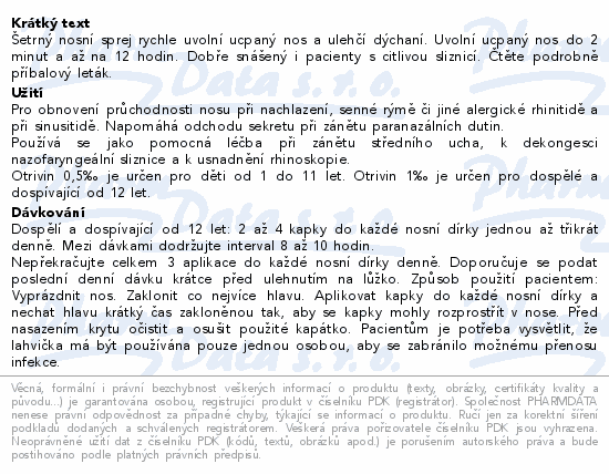 Šetrný nosní sprej rychle uvolní ucpaný nos a ulehčí dýchaní. Uvolní ucpaný nos do 2 minut a až na 12 hodin. Dobře snášený i pacienty s citlivou sliznicí. Čtěte pozorně příbalový leták.
