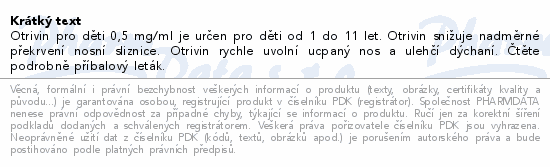 Otrivin pro děti 0,5 mg/ml je určen pro děti od 1 do 11 let. Otrivin snižuje nadměrné překrvení nosní sliznice. Otrivin rychle uvolní ucpaný nos a ulehčí dýchaní. Čtěte pozorně příbalový leták.