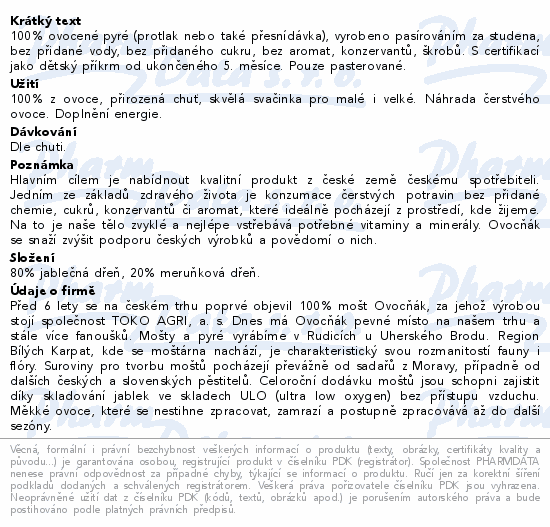 100% ovocené pyré (protlak nebo také přesnídávka), vyrobeno pasírováním za studena, bez přidané vody, bez přidaného cukru, bez aromat, konzervantů, škrobů. S certifikací jako dětský příkrm od ukončeného 5. měsíce. Pouze pasterované.