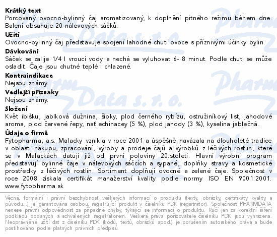 Porcovaný ovocno-bylinný čaj aromatizovaný, k doplnění pitného režimu během dne. Balení obsahuje 20 nálevových sáčků.