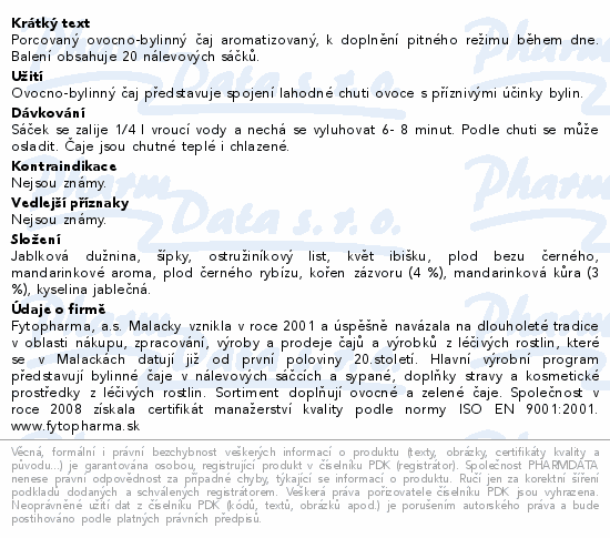 Porcovaný ovocno-bylinný čaj aromatizovaný, k doplnění pitného režimu během dne. Balení obsahuje 20 nálevových sáčků.