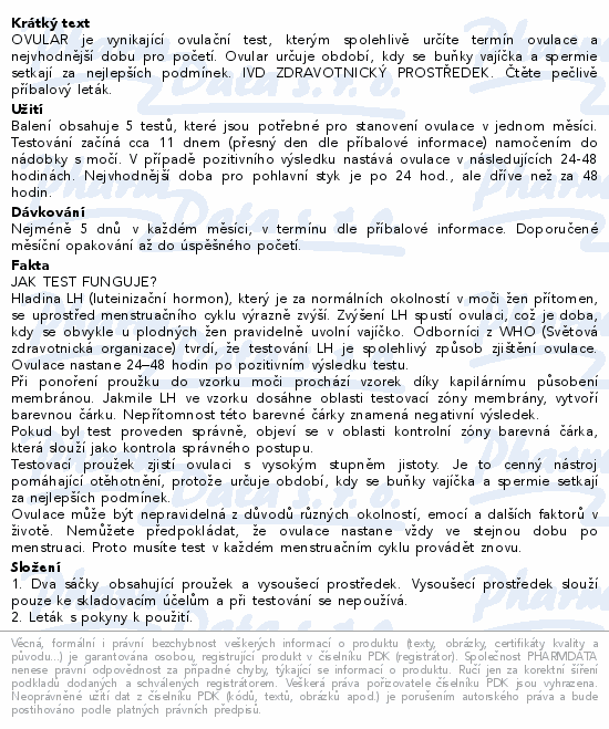 OVULAR je vynikající ovulační test, kterým spolehlivě určíte termín ovulace a nejvhodnější dobu pro početí. Ovular určuje období, kdy se buňky vajíčka a spermie setkají za nejlepších podmínek. IVD ZDRAVOTNICKÝ PROSTŘEDEK. Čtěte pečlivě příbalový leták.