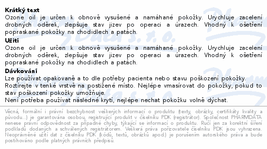 Ozone oil je určen k obnově vysušené a namáhané pokožky. Urychluje zacelení drobných oděrek, zlepšuje stav jizev po operaci a úrazech. Vhodný k ošetření popraskané pokožky na chodidlech a patách.