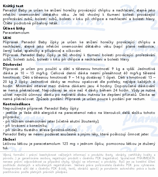 Panadol Baby je určen ke snížení horečky provázející chřipku a nachlazení, stejně jako infekční onemocnění dětského věku. Je též vhodný k tlumení bolesti provázející prořezávání zubů, bolesti zubů, bolesti v krku při chřipce a nachlazení a bolesti hlavy. Čtěte pozorně příbalový leták.