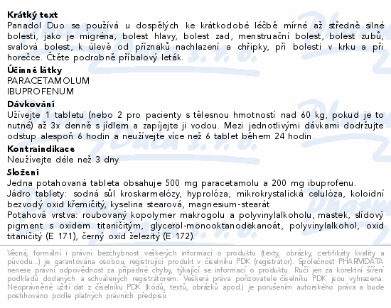 Panadol Duo se používá u dospělých ke krátkodobé léčbě mírné až středně silné bolesti, jako je migréna, bolest hlavy, bolest zad, menstruační bolest, bolest zubů, svalová bolest, k úlevě od příznaků nachlazení a chřipky, při bolesti v krku a při horečce. Čtěte pozorně příbalový leták.