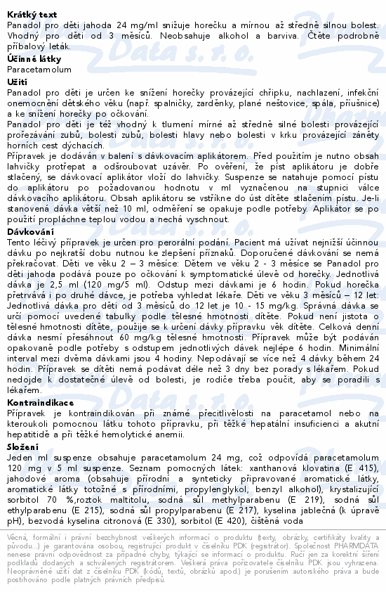 Panadol pro děti jahoda 24 mg/ml snižuje horečku a mírnou až středně silnou bolest. Vhodný pro děti od 3 měsíců. Neobsahuje alkohol a barviva. Čtěte pozorně příbalový leták.
