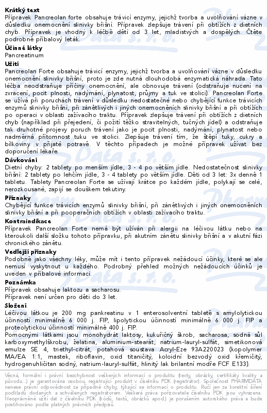 Přípravek Pancreolan forte obsahuje trávicí enzymy, jejichž tvorba a uvolňování vázne v důsledku onemocnění slinivky břišní. Přípravek zlepšuje trávení při obtížích z dietních chyb. Přípravek je vhodný k léčbě dětí od 3 let, mladistvých a dospělých. Čtěte pozorně příbalový leták.