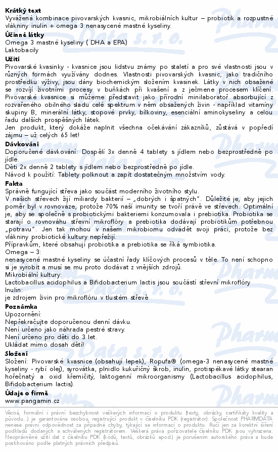 Vyvážená kombinace pivovarských kvasnic, mikrobiálních kultur – probiotik a rozpustné vlákniny inulin + omega 3 nenasycené mastné kyseliny.