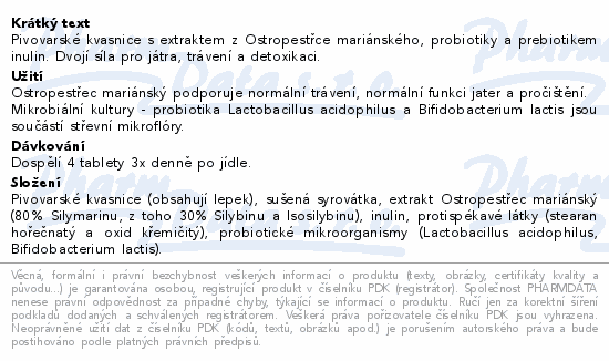 Pivovarské kvasnice s extraktem z Ostropestřce mariánského, probiotiky a prebiotikem inulin. Dvojí síla pro játra, trávení a detoxikaci.