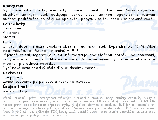 Nyní nově extra chladivý efekt díky přidanému mentolu. Panthenol Swiss s vysokým obsahem účinných látek poskytuje rychlou úlevu, účinnou regeneraci a vyživení sluncem podrážděné pokožky po opalování, pobytu v soláriu nebo v chlorované vodě.