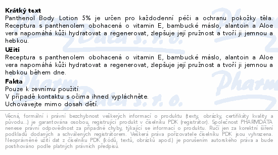 Panthenol Body Lotion 5% je určen pro každodenní péči a ochranu pokožky těla. Receptura s panthenolem obohacená o vitamin E, bambucké máslo, alantoin a Aloe vera napomáhá kůži hydratovat a regenerovat, zlepšuje její pružnost a tvoří ji jemnou a hebkou.