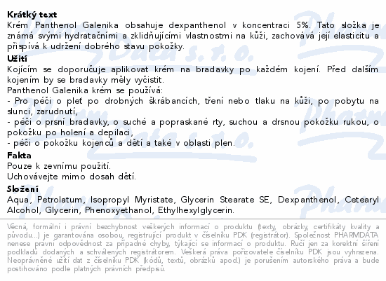 Krém Panthenol Galenika obsahuje dexpanthenol v koncentraci 5%. Tato složka je známá svými hydratačními a zklidňujícími vlastnostmi na kůži, zachovává její elasticitu a přispívá k udržení dobrého stavu pokožky.