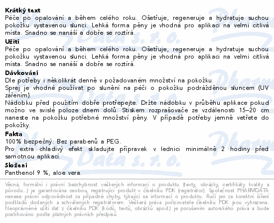 Péče po opalování a během celého roku. Ošetřuje, regeneruje a hydratuje suchou pokožku vystavenou slunci. Lehká forma pěny je vhodná pro aplikaci na velmi citlivá místa. Snadno se nanáší a dobře se roztírá.