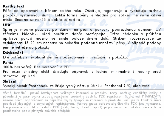 Péče po opalování a během celého roku. Ošetřuje, regeneruje a hydratuje suchou pokožku vystavenou slunci. Lehká forma pěny je vhodná pro aplikaci na velmi citlivá místa. Snadno se nanáší a dobře se roztírá.