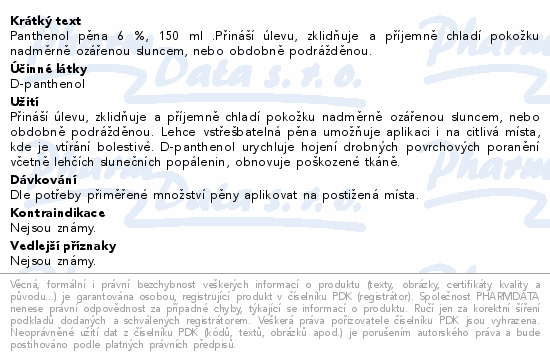 Panthenol pěna 6 %, 150 ml .Přináší úlevu, zklidňuje a příjemně chladí pokožku nadměrně ozářenou sluncem, nebo obdobně podrážděnou.