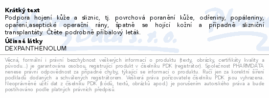 | Farmako-terapeutická skupina, účinné látky: | DERMATOLOGIKA -> PŘÍPRAVKY PRO LÉČBU RAN A VŘEDŮ -> LÉČIVA PODPORUJÍ TVORBU JIZEV -> JINÁ LÉČIVA PODPORUJÍCÍ TVORBU JIZEV -> DEXPANTHENOL |