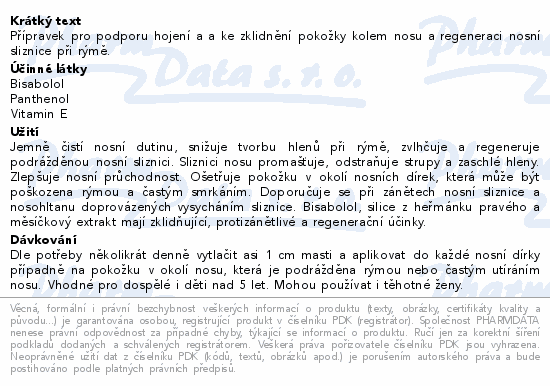Přípravek pro podporu hojení a a ke zklidnění pokožky kolem nosu a regeneraci nosní sliznice při rýmě.