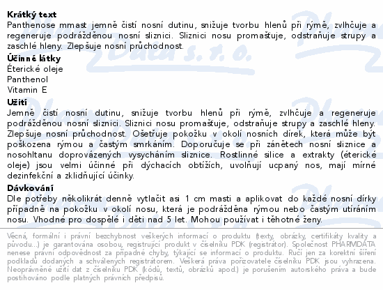 Panthenose mmast jemně čistí nosní dutinu, snižuje tvorbu hlenů při rýmě, zvlhčuje a regeneruje podrážděnou nosní sliznici. Sliznici nosu promašťuje, odstraňuje strupy a zaschlé hleny. Zlepšuje nosní průchodnost.