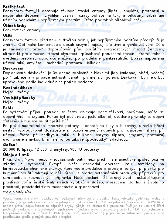 Panzynorm forte_N obsahuje základní trávicí enzymy (lipázu, amylázu, proteázu) a napomáhá zlepšení i zrychlení zažívání stravy bohaté na tuky a bílkoviny, zabraňuje trávicím poruchám i nepříjemným pocitům. Čtěte pozorně příbalový leták.