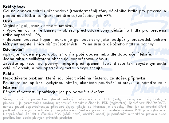 Gel na obnovu epitelu přechodové (transformační) zóny děložního hrdla pro prevenci a podpůrnou léčbu lézí (poranění sliznice) způsobených HPV.