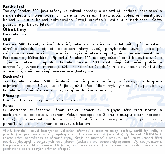 Tablety Paralen 500 jsou určeny ke snížení horečky a bolesti při chřipce, nachlazení a jiných infekčních onemocněních. Dále při bolestech hlavy, zubů, bolestivé menstruaci, bolesti v krku a bolesti pohybového ústrojí provázející chřipku a nachlazení. Čtěte pozorně příbalový leták.