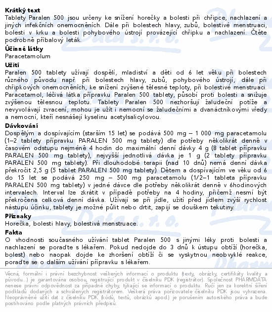 Tablety Paralen 500 jsou určeny ke snížení horečky a bolesti při chřipce, nachlazení a jiných infekčních onemocněních. Dále při bolestech hlavy, zubů, bolestivé menstruaci, bolesti v krku a bolesti pohybového ústrojí provázející chřipku a nachlazení. Čtěte pozorně příbalový leták.