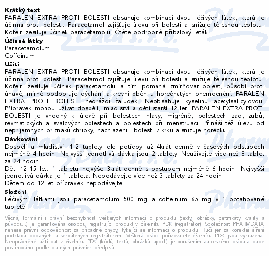 PARALEN EXTRA PROTI BOLESTI obsahuje kombinaci dvou léčivých látek, která je účinná proti bolesti. Paracetamol zajišťuje úlevu při bolesti a snižuje tělesnou teplotu. Kofein zesiluje účinek paracetamolu. Čtěte pozorně příbalový leták.