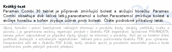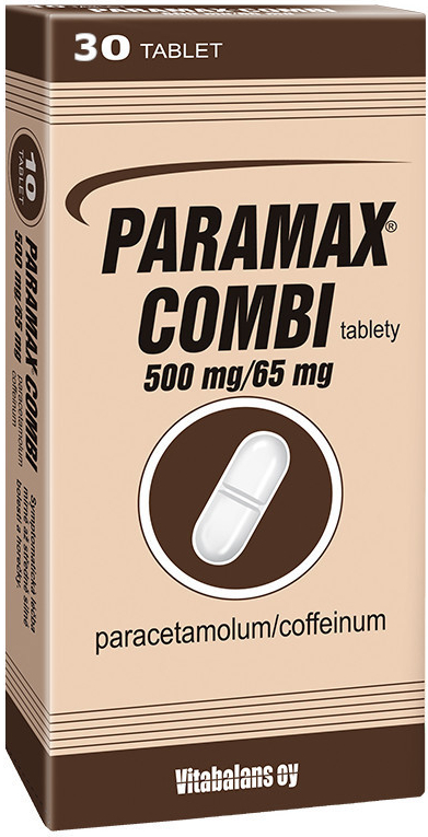 Paramax Combi 30 tablet je přípravek zmírňující bolest a snižující horečku. Paramax Combi obsahuje dvě léčivé látky,paracetamol a kofein.Paracetamol zmírňuje bolest a snižeje horečku a kofein zvyšuje účinek proti bolesti. Čtěte pozorně příbalový leták.