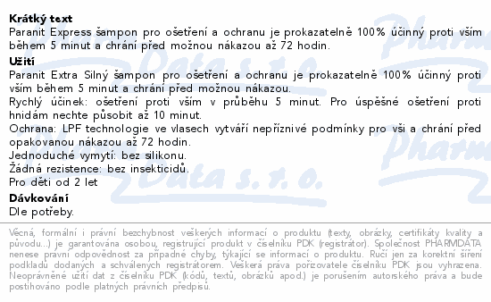 Paranit Express šampon pro ošetření a ochranu je prokazatelně 100% účinný proti vším během 5 minut a chrání před možnou nákazou až 72 hodin.
