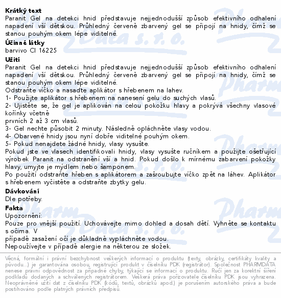 Paranit Gel na detekci hnid představuje nejjednodušší způsob efektivního odhalení napadení vší dětskou. Průhledný červeně zbarvený gel se připojí na hnidy, čímž se stanou pouhým okem lépe viditelné.
