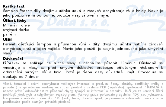 Šampon Paranit díky dvojímu účinku udusí a zároveň dehydratuje vši a hnidy. Navíc je jeho použití velmi pohodlné, protože vlasy zároveň i myje.