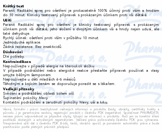 Paranit Radikální sprej pro ošetření je prokazatelně 100% účinný proti vším a hnidám do 10 minut. Klinicky testovaný přípravek s prokázaným účinkem proti vši dětské.