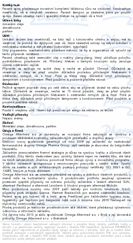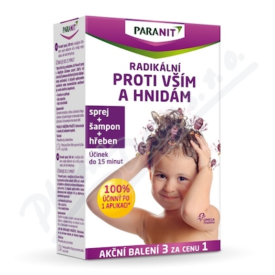 Paranit sprej představuje inovativní kompletní léčebnou kůru na odvšivení. Neobsahuje insekticidy, vši si nevytváří resistenci. Paranit šampon je následná péče po použití spreje. Balení obsahje navíc i speciální hřeben na vyčesání vší a hnid.