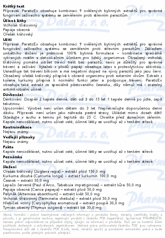 Přípravek ParatizEx obsahuje kombinaci 9 ověřených bylinných extraktů které napomáhají ke správnému fungování zažívacího systému se zaměřením proti střevním parazitům.