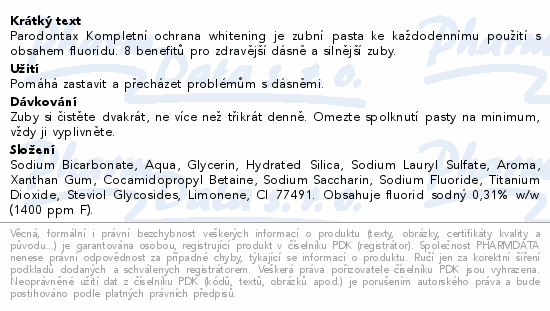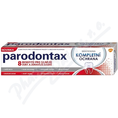 Parodontax Kompletní ochrana whitening je zubní pasta ke každodennímu použití s obsahem fluoridu. 8 benefitů pro zdravější dásně a silnější zuby.