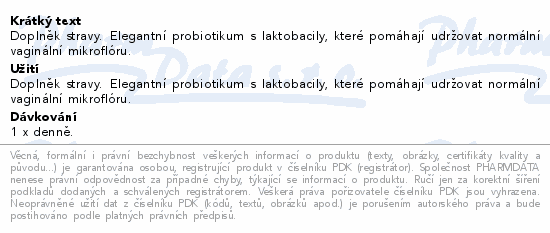 Doplněk stravy. Elegantní probiotikum s laktobacily, které pomáhají udržovat normální vaginální mikroflóru.