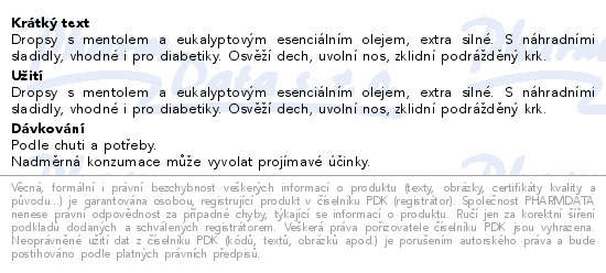 Dropsy s mentolem a eukalyptovým esenciálním olejem, extra silné. S náhradními sladidly, vhodné i pro diabetiky. Osvěží dech, uvolní nos, zklidní podrážděný krk.