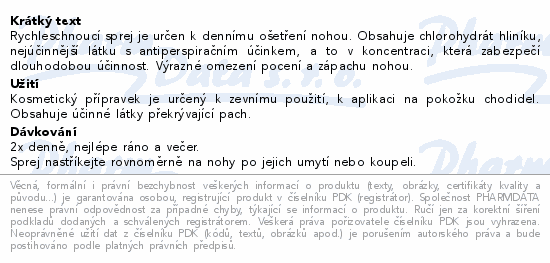 Rychleschnoucí sprej je určen k dennímu ošetření nohou. Obsahuje chlorohydrát hliníku, nejúčinnější látku s antiperspiračním účinkem, a to v koncentraci, která zabezpečí dlouhodobou účinnost. Výrazné omezení pocení a zápachu nohou.