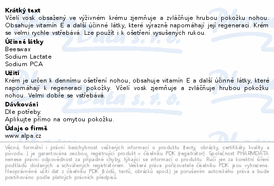 Včelí vosk obsažený ve výživném krému zjemňuje a zvláčňuje hrubou pokožku nohou. Obsahuje vitamín E a další účinné látky, které výrazně napomáhají její regeneraci. Krém se velmi rychle vstřebává. Lze použít i k ošetření vysušených rukou.