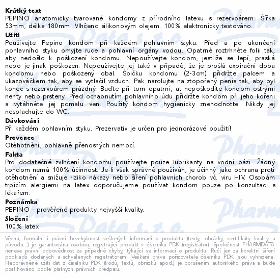 PEPINO anatomicky tvarované kondomy z přírodního latexu s rezervoárem. Šířka 53mm, délka 180mm. Vlhčeno silikonovým olejem. 100% elektronicky testováno.