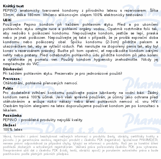 PEPINO anatomicky tvarované kondomy z přírodního latexu s rezervoárem. Šířka 53mm, délka 180mm. Vlhčeno silikonovým olejem.100% elektronicky testováno.