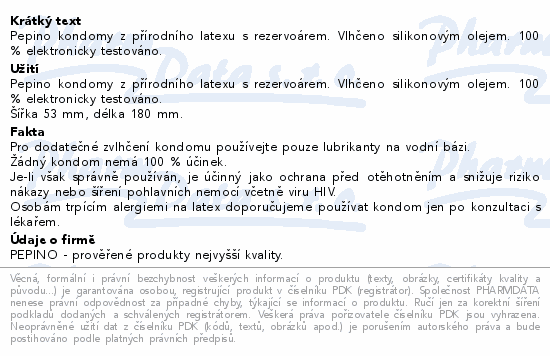 Pepino kondomy z přírodního latexu s rezervoárem. Vlhčeno silikonovým olejem. 100 % elektronicky testováno. Šířka 53 mm, délka 190 mm.