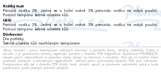 Peroxid vodíku 3%. Jedná se o kožní roztok 3% peroxidu vodíku na vnější použití. Pomocí tampónu šetrně očistěte kůži.