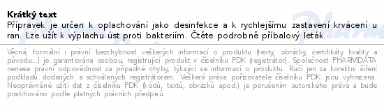 Přípravek je určen k oplachování jako desinfekce a k rychlejšímu zastavení krvácení u ran. Lze užít k výplachu úst proti bakteriím. Čtěte pozorně příbalový leták.
