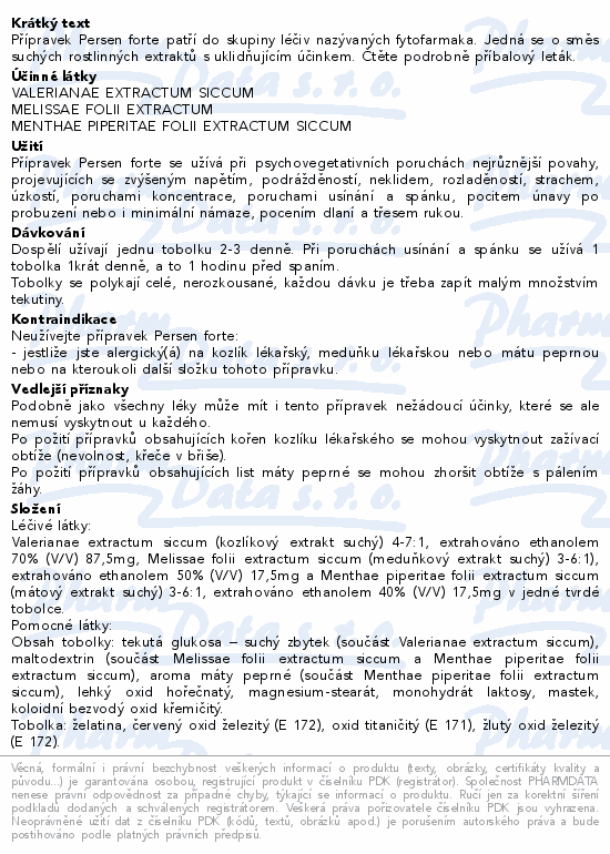 Přípravek Persen forte patří do skupiny léčiv nazývaných fytofarmaka. Jedná se o směs suchých rostlinných extraktů s uklidňujícím účinkem. Čtěte pozorně příbalový leták.